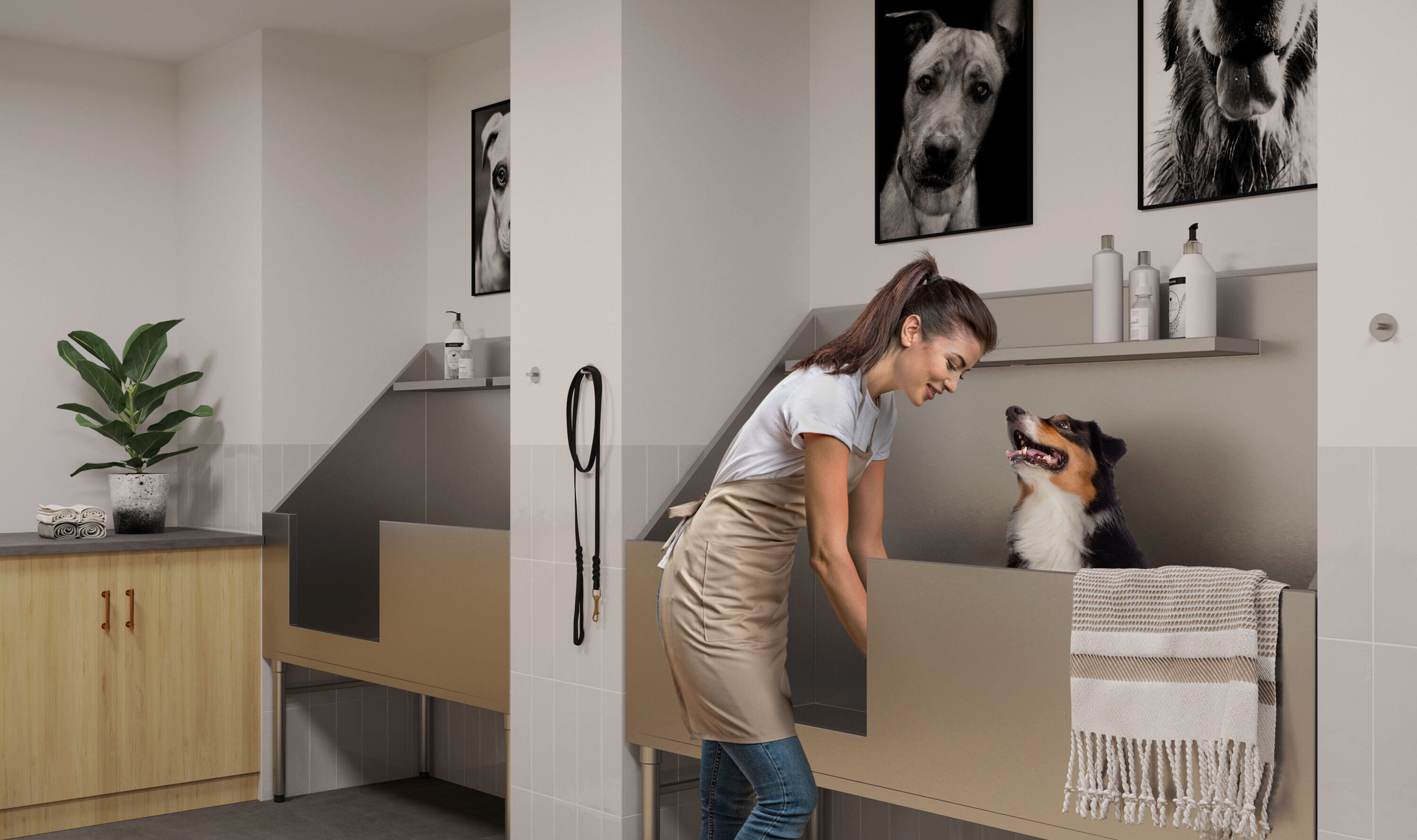 - Dog spa with ready-to-use washing stations and dryers